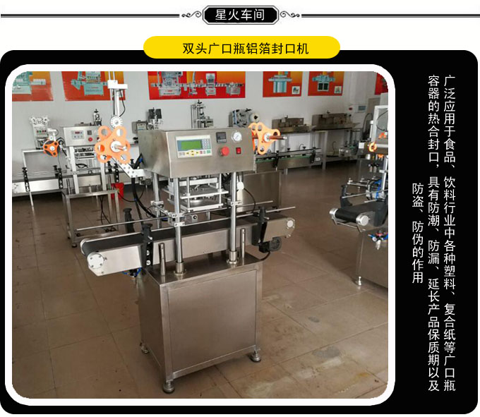 廣泛應(yīng)用于食品、飲料行業(yè)中各種塑料、復(fù)合紙等廣口瓶容器的熱合封口,具有防潮、防漏、延長(zhǎng)產(chǎn)品保質(zhì)期以及防盜、防偽的作用