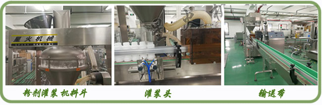 其中粉劑灌裝機(jī)采用了先進(jìn)的PLC+伺服馬達(dá)+觸摸屏等先進(jìn)模式,整套設(shè)備性能穩(wěn)定、精度高,全不銹鋼結(jié)構(gòu),整個(gè)灌裝過程采用了智能的控制系統(tǒng),能完成瓶子自動(dòng)定位、充填及計(jì)量等工作,他由一個(gè)充填頭、一臺(tái)鏈板輸送帶及一個(gè)定位裝置組成,是一款經(jīng)濟(jì)實(shí)用的粉末及小顆粒自動(dòng)灌裝機(jī)。另外該套設(shè)備配有位置合理的高度調(diào)節(jié)手輪 ,方便調(diào)整機(jī)頭高度。其配套裝置包括:氣動(dòng)閥門裝置、防漏離心裝置、托罐裝置、水平開啟式料箱、在線稱重計(jì)量裝置、除塵裝置